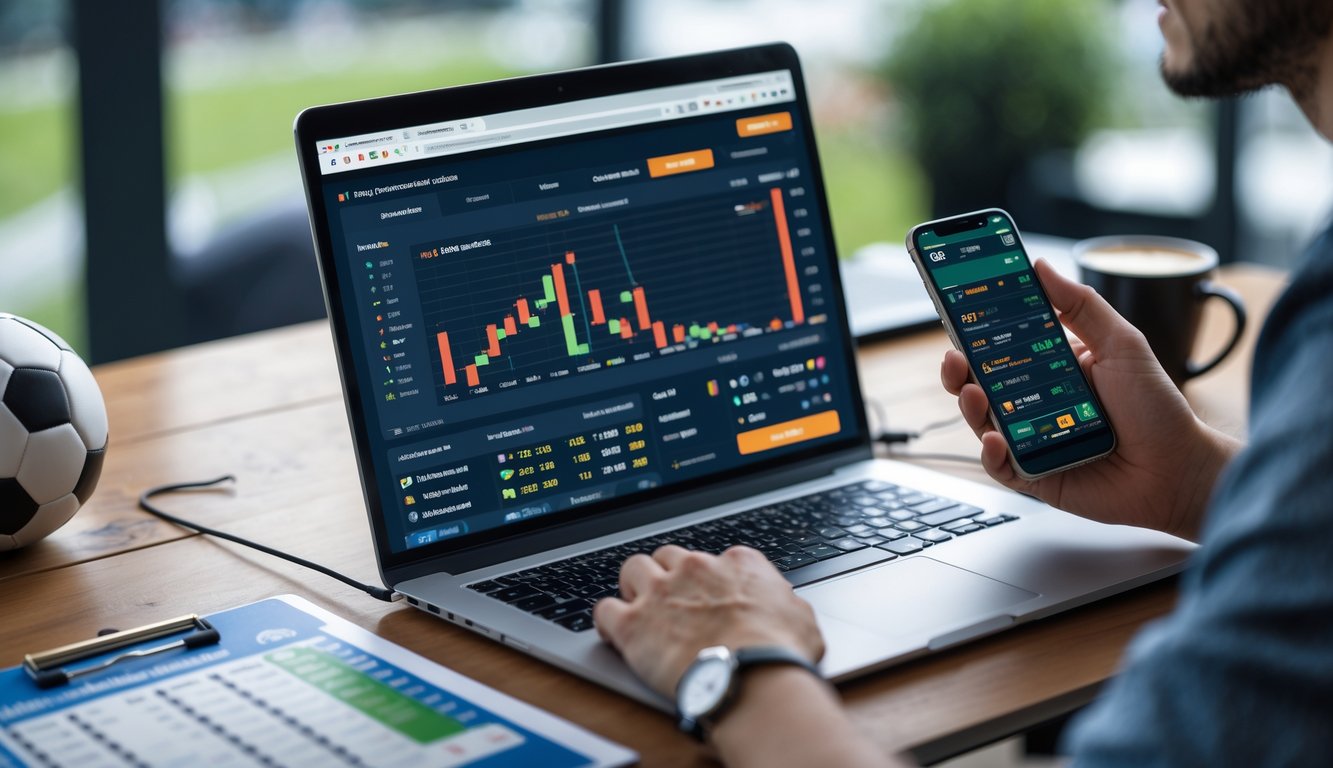 Sebuah ruang kerja modern dengan laptop menampilkan statistik pemain sepak bola dan grafik taruhan, dikelilingi catatan, ponsel dengan pertandingan sepak bola langsung, dan secangkir kopi.