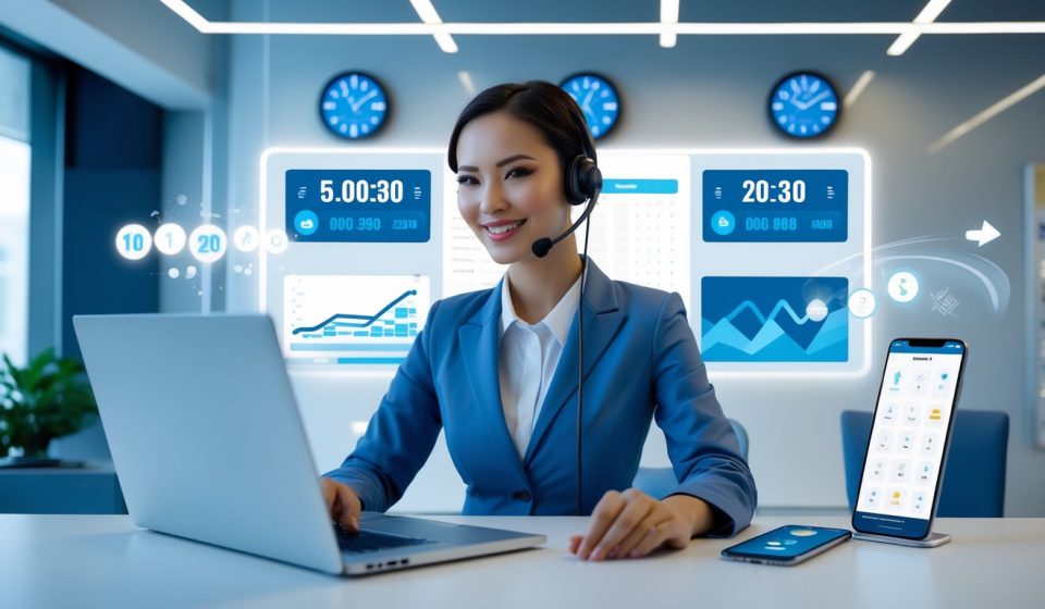 Seorang perwakilan layanan pelanggan sedang bekerja dengan laptop di kantor modern dengan jam digital di latar belakang menunjukkan layanan nonstop.